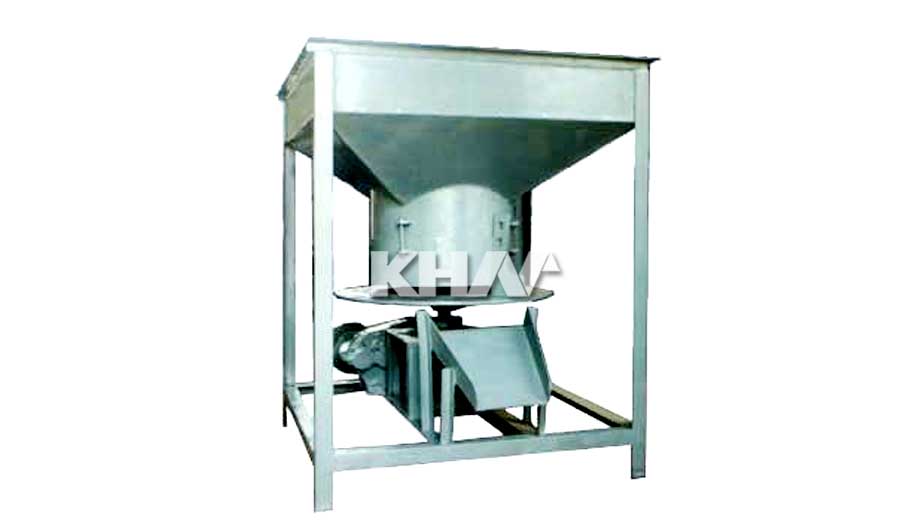 散狀物料從料斗裝入受料筒中,物料沒受料筒壁借本身自重堆積在圓盤上,用調(diào)節(jié)螺栓調(diào)整套筒與圓盤之間的間隙,可以控制物料在圓盤上的自然堆角。圓盤轉(zhuǎn)動(dòng)時(shí),物料被圓盤上的卸料刀均勻地刮到圓盤外下落,這樣隨著圓盤轉(zhuǎn)動(dòng),物料便由卸料刀均勻刮入接料斗中。圓盤連續(xù)運(yùn)轉(zhuǎn),就完成了均勻的給料操作。調(diào)整卸料刀與圓盤之間的間隙,也可以控制給料量的多少。工作時(shí),電動(dòng)機(jī)通過皮帶輪帶動(dòng)裝在蝸桿減速器上的圓盤轉(zhuǎn)動(dòng)。