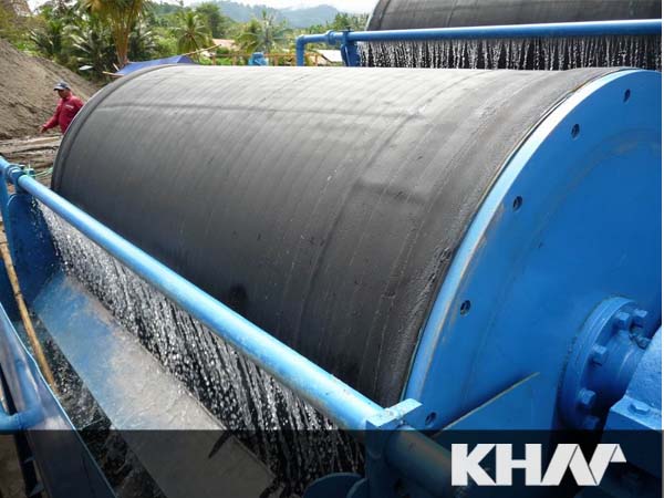 由于磁極的極性沿圓筒旋轉(zhuǎn)方向是交替排列的,并且在工作時(shí)固定不動(dòng),“磁團(tuán)”或“磁鏈”在隨圓筒旋轉(zhuǎn)時(shí),由于磁極交替而產(chǎn)生磁攪拌現(xiàn)象,被夾雜在“磁團(tuán)”或“磁鏈”中的脈石等非磁性礦物在翻動(dòng)中脫落下來(lái),最終被吸在圓筒表面的“磁團(tuán)”或“磁鏈”即是精礦。精礦隨圓筒轉(zhuǎn)到磁系邊緣磁力最弱處,在卸礦水管噴出的沖洗水流作用下被卸到精礦槽中,如果是全磁磁輥,卸礦是用刷輥進(jìn)行的。非磁性或弱磁性礦物被留在礦漿中隨礦漿排出槽外,即是尾礦。